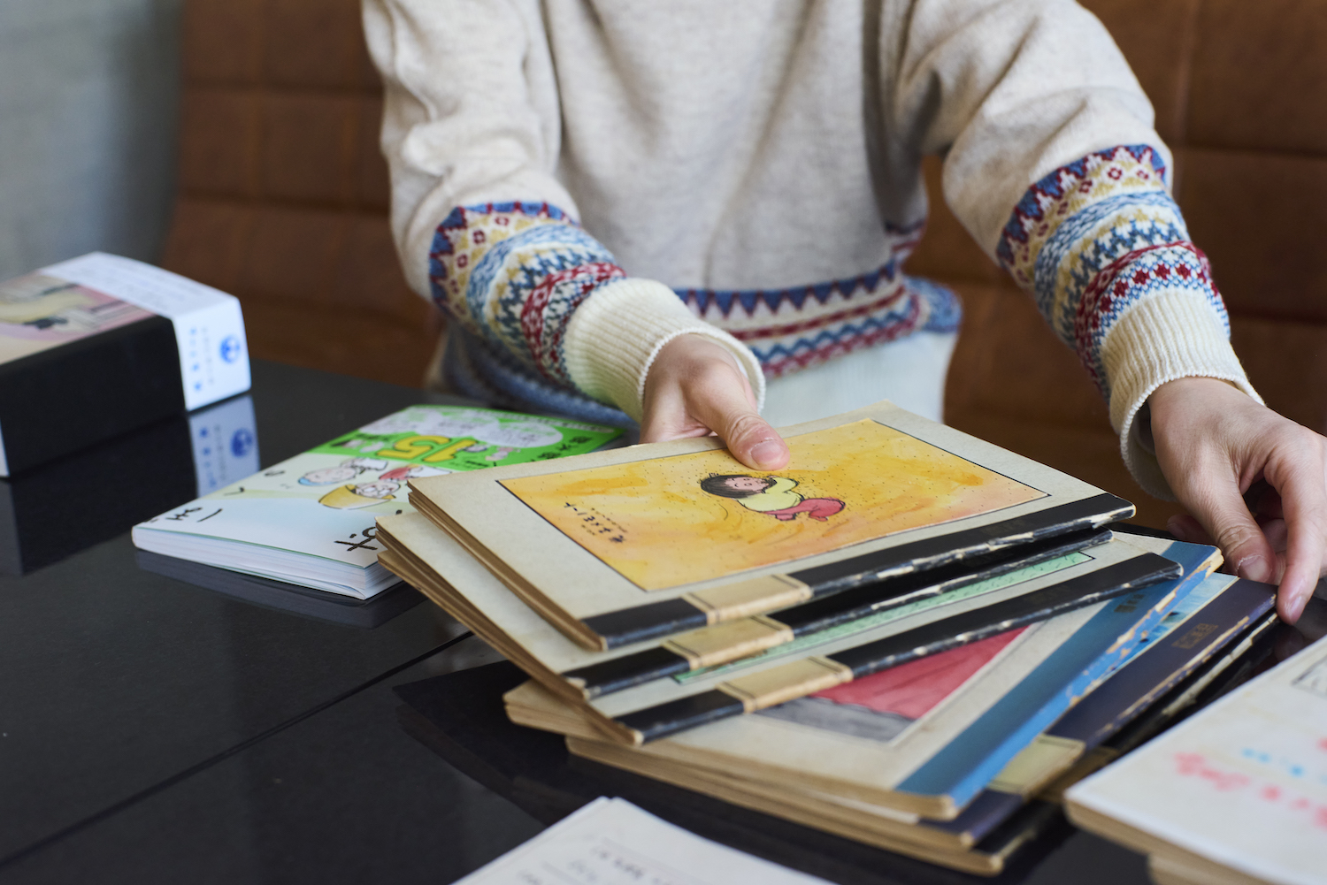 みつのりさん:そうです、アトリエの本棚ですね。僕にとっては大事な物なので、自作のケースに数冊ずつ入れて本棚に置いていました。